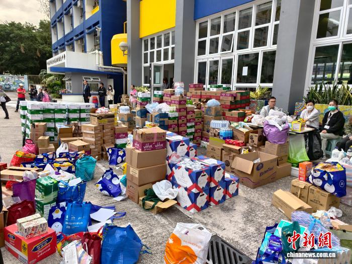 11月27日,香港大埔宏福苑邻近的中华基督教会冯梁结留念中学内摆满捐献物资。中新社记者 戴梦岚摄